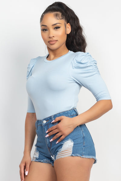 ImportedS.M.LA knit casual shirt top in solid color featuring a round neckline, 3/4 puff ruched sleeves design, and a waist-length.94% Polyester 6% Spandex Baby Blue IRI Round Neck Puff Ruched Sleeve Top Item Measurements: SIZE SMeasurements: S...