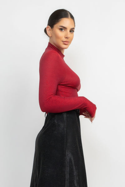 This bodysuit stands out with its glittery fabric and elegant mock neck, offering a blend of sophistication and modern style. The ruby color adds a vibrant pop, making it a perfect choice for special occasions or a chic, elevated look.