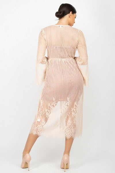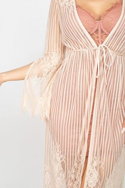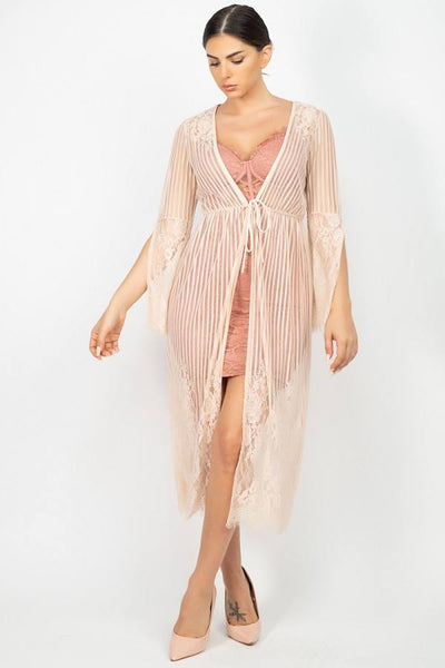 A knit sheer vest, featuring stripe lace cinched scallop edge kimono a plunging V-neckline, an open front, and a over the knee length.
