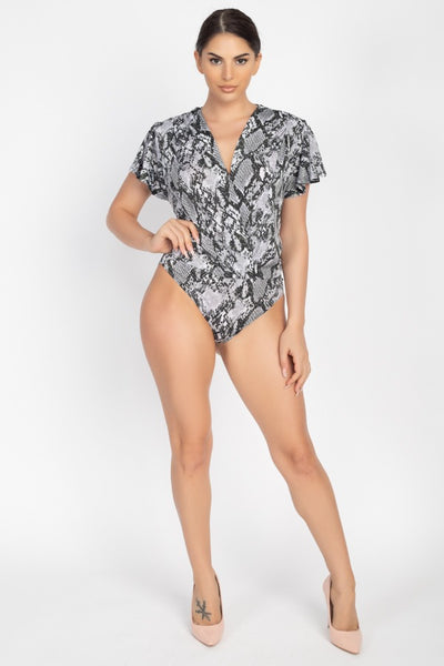 A knit bodysuit featuring an allover snakeskin print, a V neckline, short butterfly sleeves, a cheeky cut, and snap-button bottom closures