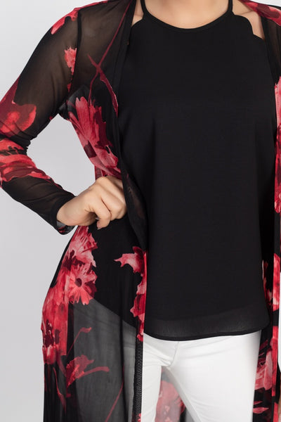 A sheer mesh knit longline jacket featuring an all over flower print, long sleeves, an open front, and side slits.