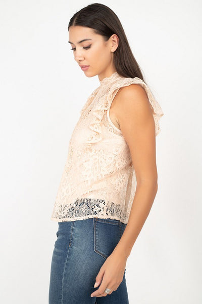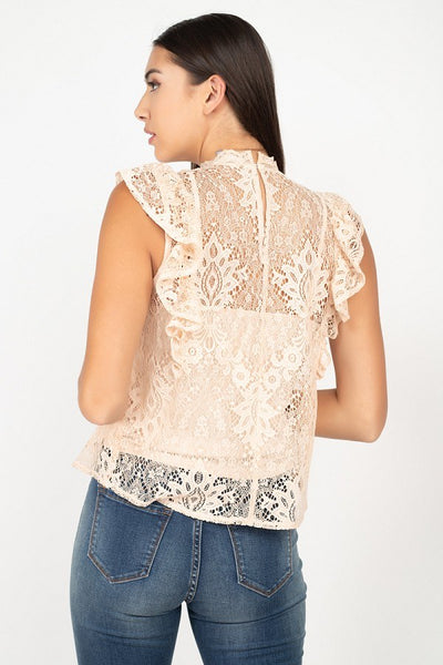 A sleeveless woven top featuring lace lace lining, a mock neckline, ruffle details, and a back keyhole.