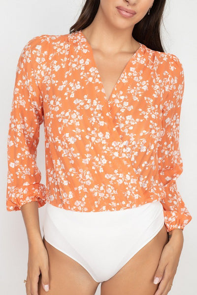 A semi sheer woven bodysuit featuring an allover floral and shadow striped design, a V neckline with a concealed snap-button closure, a front wrap design, long sleeves with elasticized cuffs, back pleats, and snap-button bottom closures.