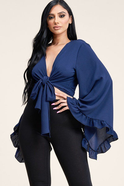 Solid Bubble Crepe Tie Front Ruffled Long Sleeve Top