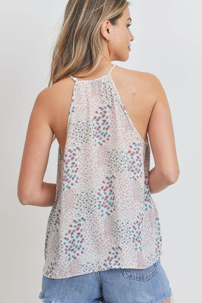 Halter Neck Top. Sleeveless. Back Button on Left Strap. Floral Details