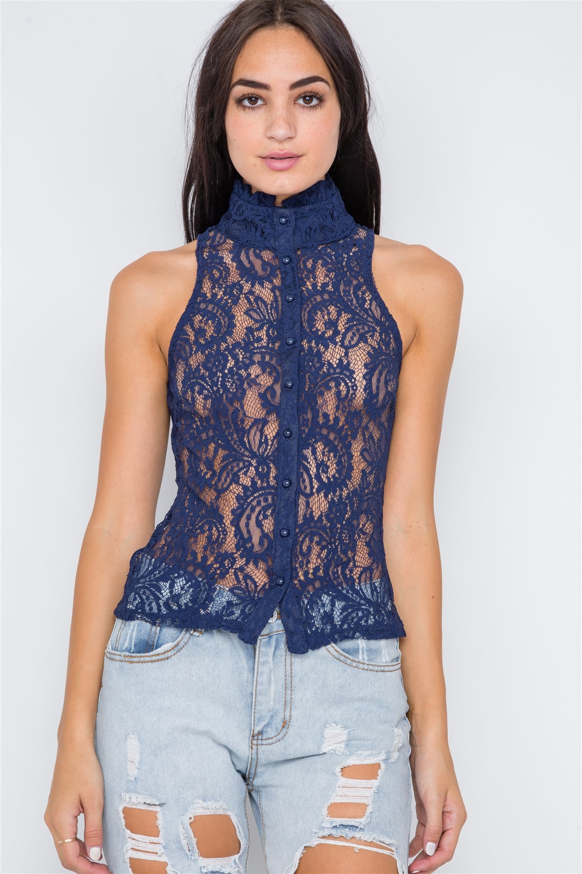 sleeveless, mock-neck with ruffle detail, front button closure, fully sheer