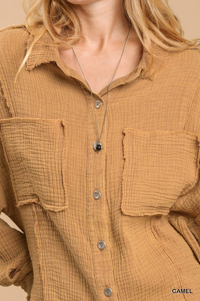 Mineral Wash Button Down Top with High Low Hem