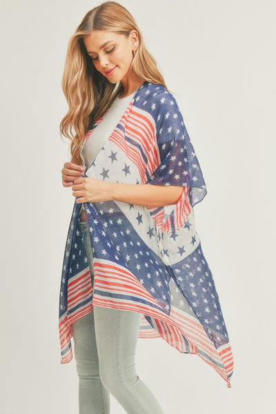 Make a bold statement with the Multi Striped American Flag Kimono, a vibrant take on patriotic fashion. Featuring multi-directional stripes in red, white, and blue, this kimono merges modern style with classic Americana vibes. The soft, lightweight fabric drapes comfortably over any outfit for an effortless look. Perfect for holidays, festivals, or casual outings, it adds both flair and comfort. Celebrate your style with this striking and versatile layering piece.