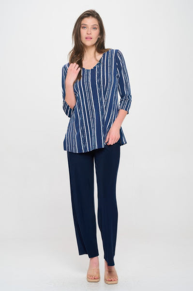 Elevate your wardrobe with the HIT V-Neck Band Top featuring a vented hem and a flattering silhouette. Designed with a chic V-neckline and wide banded hem, this printed top offers a modern twist on a classic favorite. The vented sides enhance movement and create a flowing, relaxed fit. Crafted from soft stretch fabric, it ensures day-long comfort while retaining its shape. Perfect for both casual and workwear looks, it's proudly made in the USA.