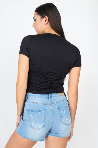 A solid knit top featuring ruched sides with self-tie drawstring, round neckline, short sleeves, fitted silhouette, and a cropped hem.