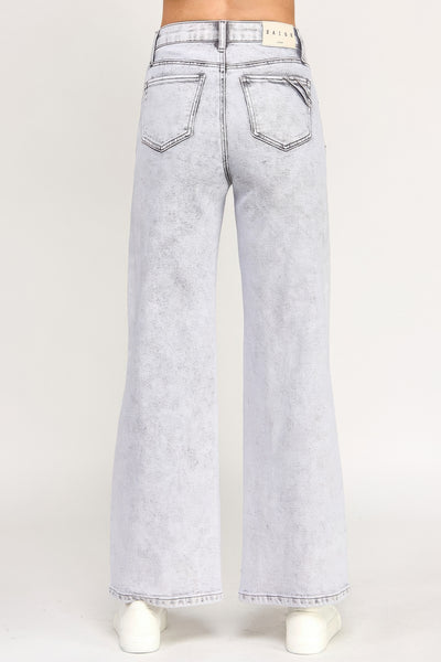 Make a bold statement with these high-rise wide-leg jeans in an eye-catching acid grey wash. The full-length silhouette elongates the leg, while the relaxed wide-leg fit offers both comfort and modern appeal. Crafted from a soft, stretch-infused blend, these jeans move effortlessly with you while maintaining their shape. Subtle distressing adds an edgy finish, perfectly balancing the structured fit with a lived-in look. Finished with classic 5-pocket styling and a zipper fly, they’re an ideal choice for standout everyday wear.